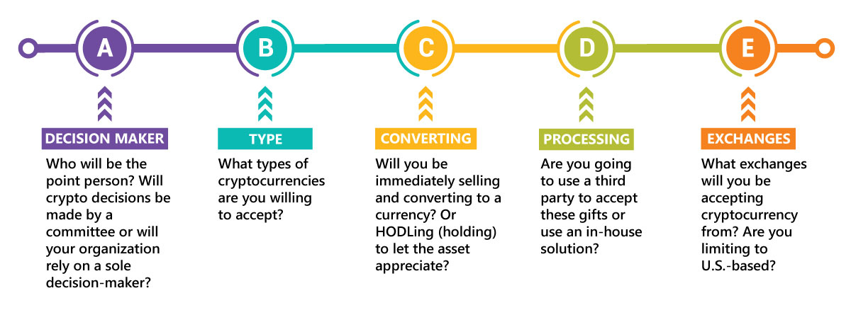 Determining your gift acceptance policy will be crucial for the success of your overall crypto-fundraising program. A formal written policy is a must when accepting gifts of cryptocurrency. There are a few questions that need to be asked: