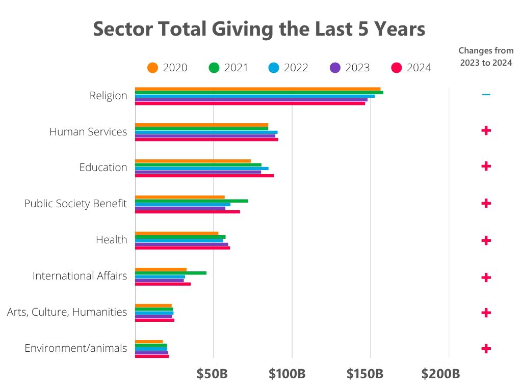 The fact that Human Services has maintained its lead over Education, even as Education giving also grew significantly, signals a shift in donor priorities, which continue to prioritize basic needs and community supporting causes—especially in the wake of pandemic-era disruptions and ongoing economic uncertainty. This highlights the importance of articulating impact in human-centered terms and aligning messaging with the values driving donor behavior today.