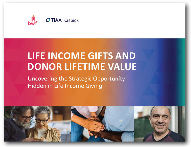 This first-of-its-kind study with BWF and TIAA Kaspick analyzed more than 20 years of donor data across three institutions. The results reveal a compelling and encouraging connection between life income gifts and increased outright giving. Download now to receive key findings and recommendations.