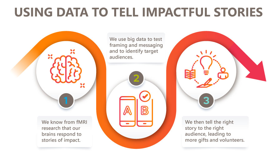 We’ve learned a tremendous amount about how the brain responds to stories of impact through experiments by Dr. Russell James, a researcher at Texas Tech University who studies psychological motivations of donors and the importance of storytelling to the giving process. What this work has shown us is nothing short of extraordinary. Through fMRI-based studies, we can see how the brain reacts to stories of transformation created by philanthropy. We no longer have to guess that this kind of storytelling is effective; we can see it with our own eyes.
